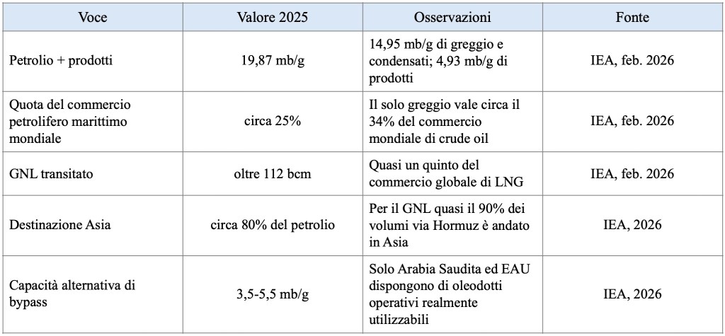 I dati riportati nel presente studio vanno letti con una precisazione metodologica: le cifre sui flussi cambiano a seconda che si considerino il solo greggio, il totale di greggio e prodotti, oppure il commercio mondiale marittimo complessivo. Per questo motivo nel testo sono state sempre esplicitate le unità di misura e il perimetro del dato. Tale cautela è necessaria per evitare confronti impropri tra percentuali relative a grandezze diverse. [Fonti: IEA, Strait of Hormuz; EIA, World Oil Transit Chokepoints.]