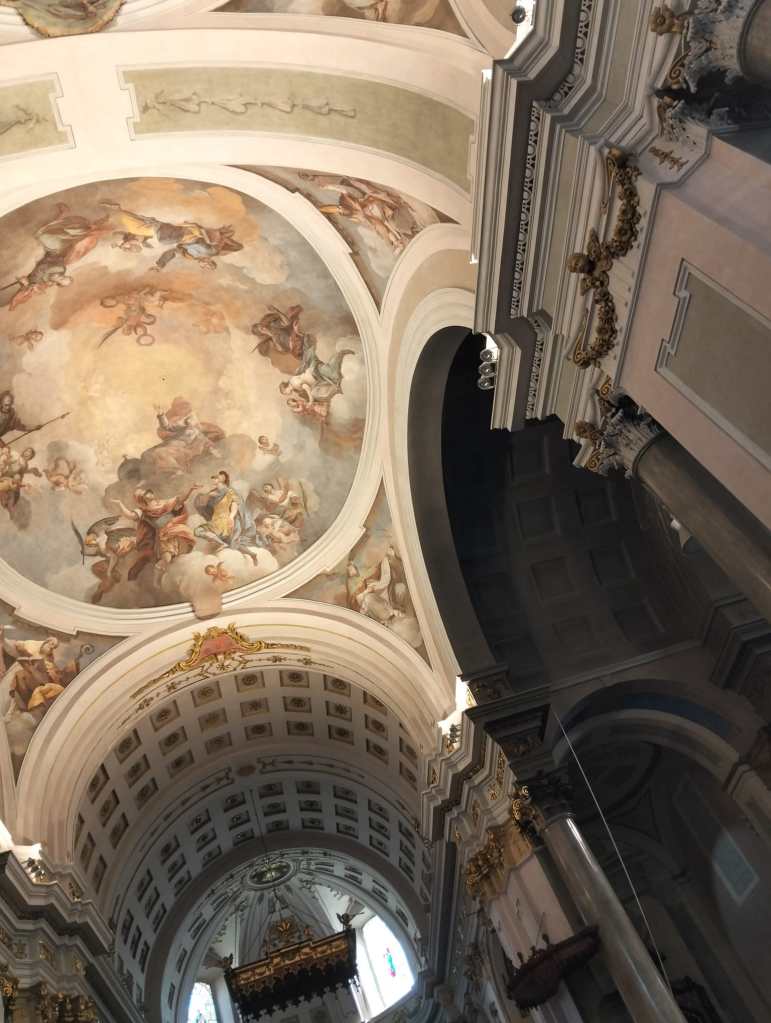 Le tre cupole non sono semplici supporti ornamentali ma nodi spaziali che marcano il tragitto verso il presbiterio. La sequenza delle immagini produce un incremento di intensità teologica e visiva: dalla comunità dei santi, alla glorificazione della Vergine, fino alla sua incoronazione da parte della Trinità. Questa progressione accompagna simbolicamente il movimento del fedele lungo la navata e innesta la pittura nella funzione liturgica dell’aula.