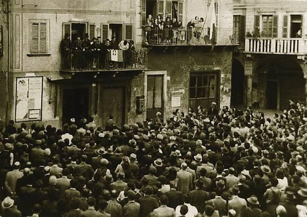folla riunita in Piazza Mercato a Domodossola nel 1944, durante i giorni della Repubblica dell’Ossola.